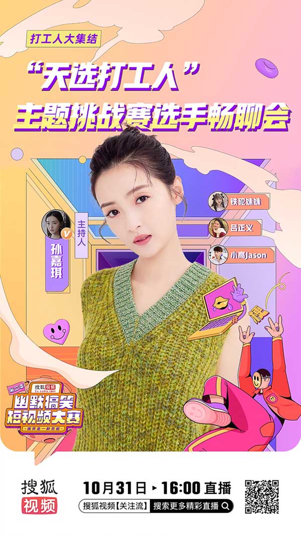 由搜狐视频主办的幽默搞笑短视频大赛第二季赛程持续推进,短视频创作达人投稿热烈,优秀参赛作品层出不穷。10月31日,本次大赛第二赛道“天选打工人”挑战赛接近尾声,搜狐签约艺人孙嘉琪带来最新点评直播,并连麦幕后主创,畅聊创作短视频的灵感和技巧,全程“干货十足”引热议。