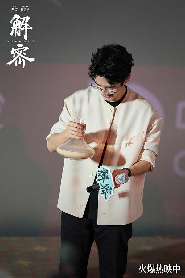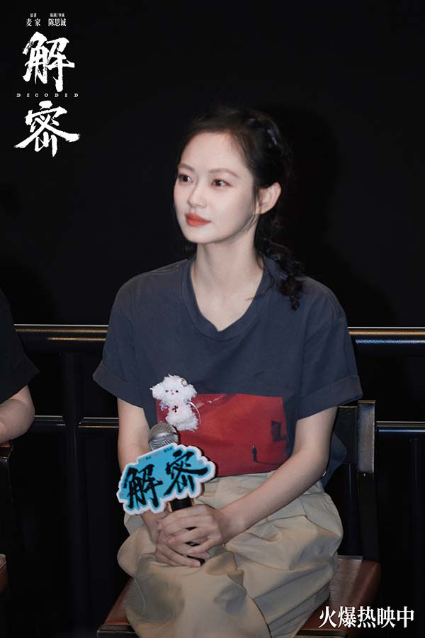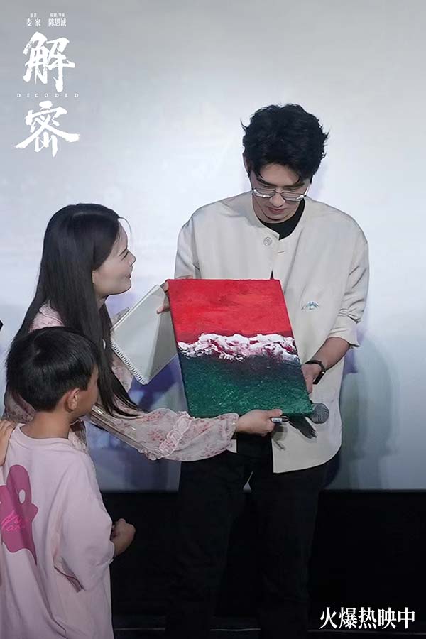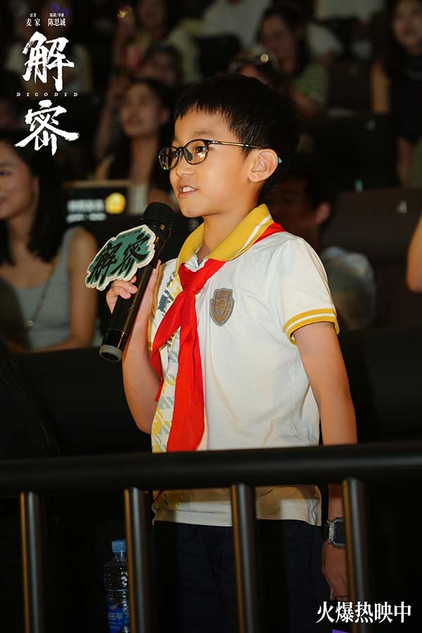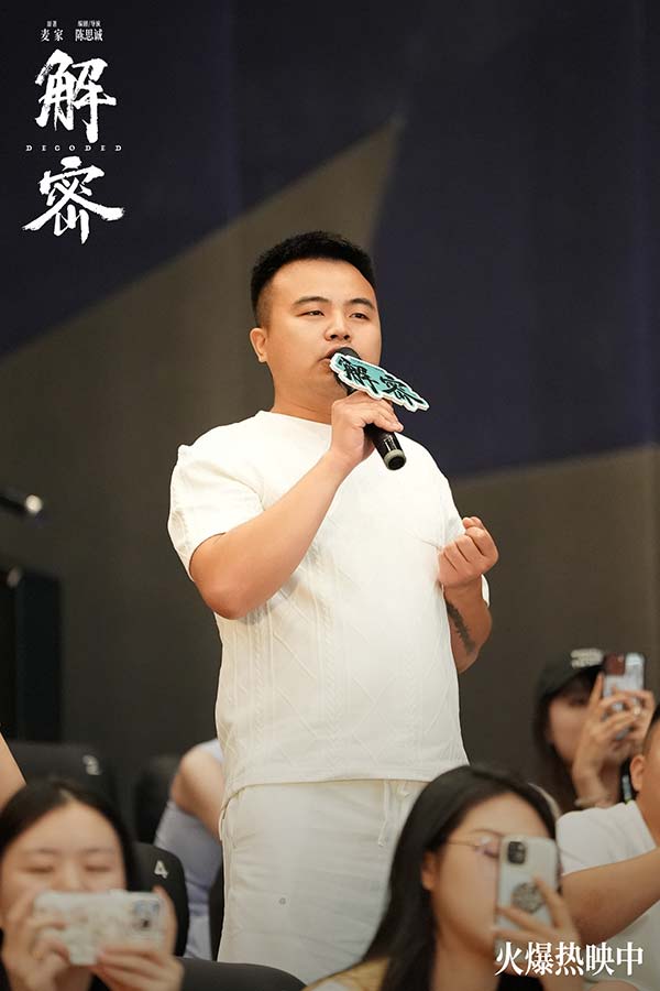 电影《解密》全国路演南昌站,编剧兼导演陈思诚,演员刘昊然、任璐遥、陈雨锶,总制片人钱重远,制片人胡婧与观众交流分享了诸多幕后故事。路演现场有不少小朋友看得非常激动,对“金珍哥哥的神奇梦境”惊叹不已。亦有观众称赞刘昊然此次造型和表演的突破,非常贴切传神地演绎出了容金珍最后油尽灯枯的状态。更有观众以“突破”总结电影《解密》,认为这不仅是陈思诚和刘昊然的个人突破,更是中国电影在类型和工业化层面的突破。导演陈思诚坦言,当导演刚好十年,需要尝试和创新,也需要站在一个做电影特别初心的地方,此次《解密》的创作初衷是想拍摄一部能留得下的电影。