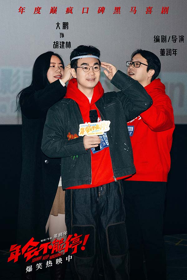 电影《年会不能停!》戏谑反讽现代职场怪象,密集的笑点和辛辣的抨击让观众深感欢乐与共情,编剧兼导演董润年、演员大鹏,白客、庄达菲在济南路演现场收获大量好评,“所有笑点都很真实”“轻松搞笑地表达出打工人的真实心声,让人在欢笑里有所感悟”。有职场新人产生强烈共鸣:“感觉白客老师和达菲姐姐就是在演我的精神状态,看的时候精神得到充分放松,这几天加班的疲惫都被纾解了,非常棒的一部电影”。还有观众幽默表示,大鹏和白客都是初代网络喜剧巨头,而喜剧巨头生活当中是不是真的“巨头”要用数据说话,所以带了尺子想量一下头围,台下观众也纷纷猜测起大鹏的头围,现场氛围颇为热烈。