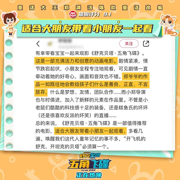 作为承载着五代人的童年回忆,电影《舒克贝塔·五角飞碟》首次登上大银幕,被不少观众直呼“孩子特别喜欢!在电影院里笑的不行”,还有很多家长表示“这就是我的童年回忆,舒克和贝塔和我小时候看的一样,还是那么聪明又勇敢”,“画面非常震撼!制作的真的特别好!”。故事内核非常具有教育意义,影片中舒克和贝塔以及小伙伴们,通过自己的勇气和努力克服了各种困难和危险,最终重建家园,主要生动刻画友情、勇气和团队协作的重要性,传递出积极向上的生活态度和勇敢面对挑战的价值观,以及在影片中增添许多有趣且紧跟时代、富有创新精神的科技元素,让人瞬间走入未来世界,以及不少精彩绝伦战斗画面,寓教于乐又看点十足,让大小朋友在愉快观影的同时更容易接受这些教育理念,非常适合新年伊始全家一起到影院欢乐观影。