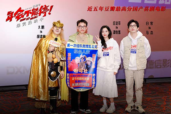 1月7日,爆笑喜剧电影《年会不能停!》杭州路演活动现场,编剧兼导演董润年、编剧兼制片人应萝佳,演员大鹏、白客、庄达菲、童漠男与观众展开交流互动。当天,电影票房突破5亿,大鹏兑现福利,以“特制皮肤”金角大王的造型亮相,并现场玩起点名梗,引爆全场热闹气氛。而《学猫叫》花絮片段也作为票房5亿福利在当天上线,年会表演不仅有“盼马壮”组合的爽燃Rap,还有肉食动物等人带来的魔性舞蹈,夸张上头的猫耳造型和“销魂”舞姿,尽显令人捧腹的喜剧“笑”果。口碑黑马巅疯喜剧,豆瓣评分8.2,正在爆笑热映中。