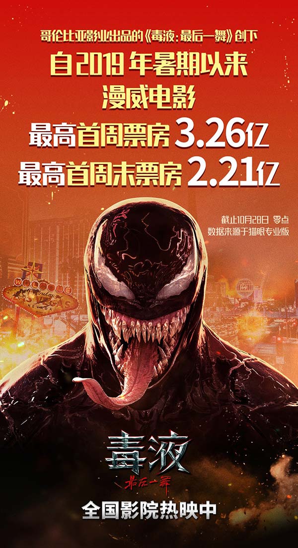《毒液:最后一舞》月上映首日,便斩获万人民币的票房佳绩,刷新了自年暑期以来漫威电影首日票房纪录。随后更连续五日蝉联票房及观影人次日冠,创下年度好莱坞电影最高首周票房成绩!截止月日零点,影片全国票房已突破亿人民币,全方位证实“毒液”顶流的魅力。