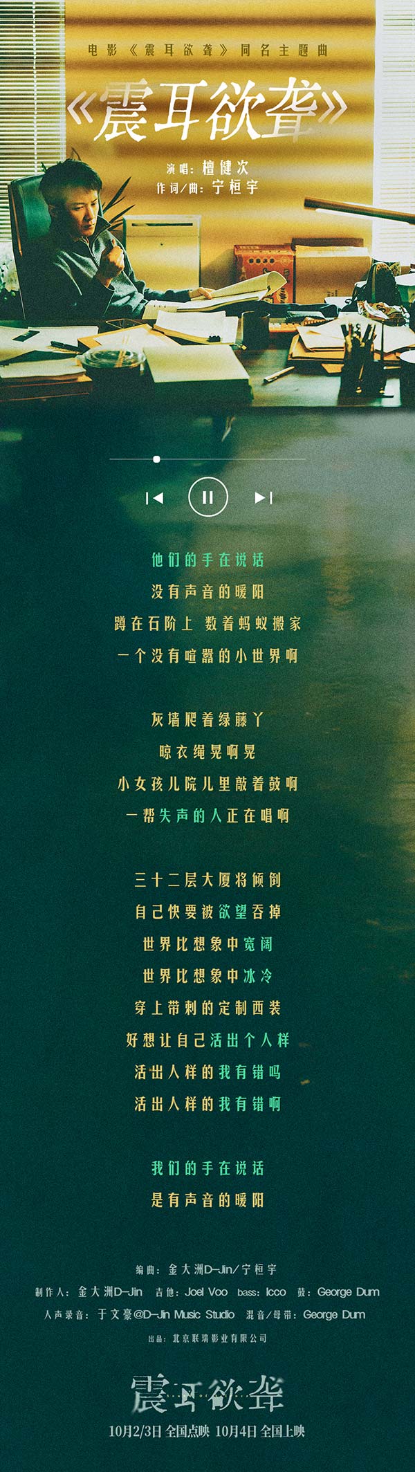 电影《震耳欲聋》由北京联瑞影业有限公司、中国电影产业集团股份有限公司、上海猫眼影业有限公司、浙江横店影业有限公司、天津木木影视传媒有限公司、深圳市一怡以艺文化传媒有限公司、大方向(哈尔滨)影业有限公司、内蒙古电影集团有限责任公司出品,联瑞(上海)影业有限公司、北京微梦创科网络技术有限公司、浙江影视(集团)有限公司、上海五星极加体育娱乐发展有限公司、江苏省电影集团有限公司、天津联瑞影业有限公司联合出品,最高人民检察院影视中心联合摄制,万力执导,饶晓志监制,檀健次领衔主演,兰西雅、王戈领衔主演,王砚辉、迟蓬特邀主演,潘斌龙特别主演,李菁菁、范翔、宁桓宇主演,周政杰友情出演,汤禹辰编剧,将于10月2日/3日进行全国点映,10月4日全国上映,敬请期待!