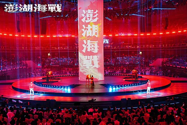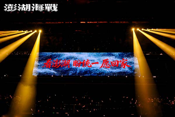 当日,由国家电影局指导,中国电影家协会支持,中宣部电影频道节目中心、四川省电影局、成都市委宣传部主办的"光影绽放·中国电影120周年活力之夜"的活动在成都市高新区万人体育中心举行。电影《澎湖海战》的演员王学圻、杜江、侯雯元、耿乐、胡明、王雨甜、王乃训、刘学参加活动,当晚本片的两位演员代表杜江、侯雯元在万人体育中心现场唱响电影宣传致敬曲《澎湖》,同时一面200平米的电影《澎湖海战》巨幅海报也缓缓地在观众席中伸展开来,巨幅海报亮相的同时,体育中心半空中一块100多平米的电子大屏上跳出“看澎湖 盼统一 愿回家”9个大字!演唱结束后,电影《澎湖海战》8位演员一起上台向观众推荐该片,齐声道出推荐语:“2026,看澎湖,盼统一,愿回家!”