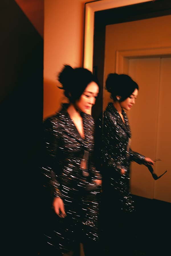 周迅身着CHANEL2023秋冬预告系列亮片斜纹软呢外套与百慕大短裤,搭配亮片刺绣手袋与高跟鞋,佩戴高级珠宝CAMÉLIA系列耳环及COMÈTE系列戒指。以闪耀自在的姿态,赴一场绮丽梦境。
