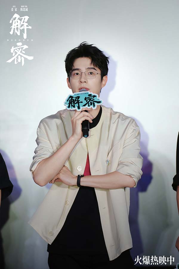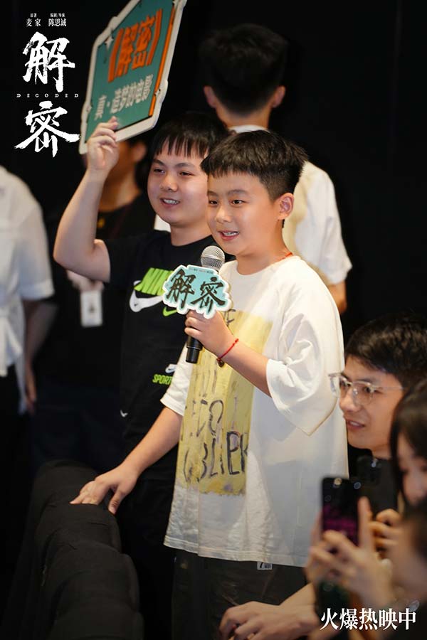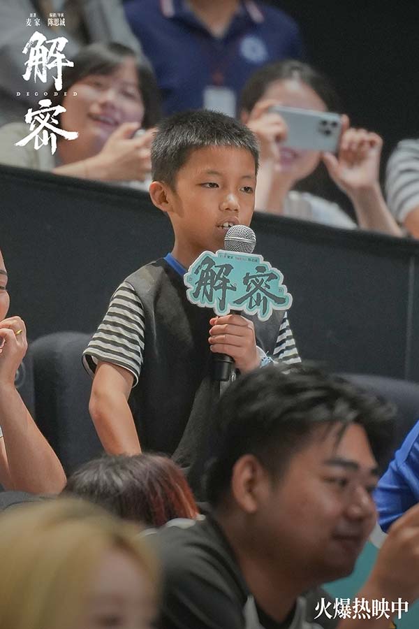 电影《解密》全国路演南昌站,编剧兼导演陈思诚,演员刘昊然、任璐遥、陈雨锶,总制片人钱重远,制片人胡婧与观众交流分享了诸多幕后故事。路演现场有不少小朋友看得非常激动,对“金珍哥哥的神奇梦境”惊叹不已。亦有观众称赞刘昊然此次造型和表演的突破,非常贴切传神地演绎出了容金珍最后油尽灯枯的状态。更有观众以“突破”总结电影《解密》,认为这不仅是陈思诚和刘昊然的个人突破,更是中国电影在类型和工业化层面的突破。导演陈思诚坦言,当导演刚好十年,需要尝试和创新,也需要站在一个做电影特别初心的地方,此次《解密》的创作初衷是想拍摄一部能留得下的电影。