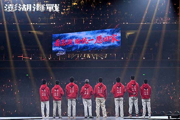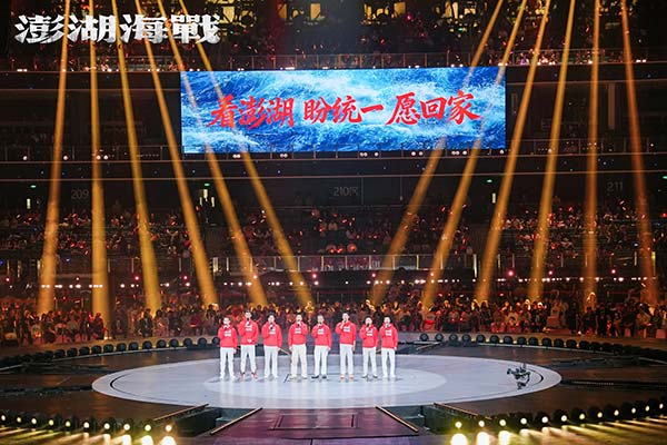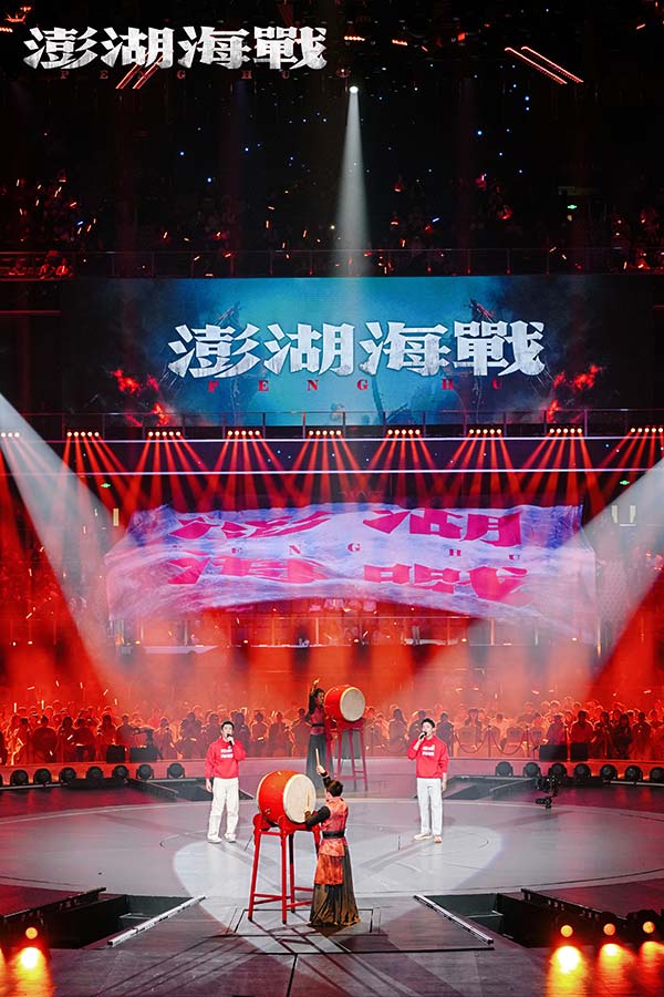 当日,由国家电影局指导,中国电影家协会支持,中宣部电影频道节目中心、四川省电影局、成都市委宣传部主办的"光影绽放·中国电影120周年活力之夜"的活动在成都市高新区万人体育中心举行。电影《澎湖海战》的演员王学圻、杜江、侯雯元、耿乐、胡明、王雨甜、王乃训、刘学参加活动,当晚本片的两位演员代表杜江、侯雯元在万人体育中心现场唱响电影宣传致敬曲《澎湖》,同时一面200平米的电影《澎湖海战》巨幅海报也缓缓地在观众席中伸展开来,巨幅海报亮相的同时,体育中心半空中一块100多平米的电子大屏上跳出“看澎湖 盼统一 愿回家”9个大字!演唱结束后,电影《澎湖海战》8位演员一起上台向观众推荐该片,齐声道出推荐语:“2026,看澎湖,盼统一,愿回家!”
